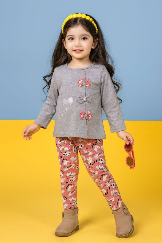 این بلوز شلوار دخترانه زیبا با طرح شگفتانگیز ۳ پاپیون و قلب، از پارچه ملانژ لاکرا ساخته شده و بسیار نرم و راحت است